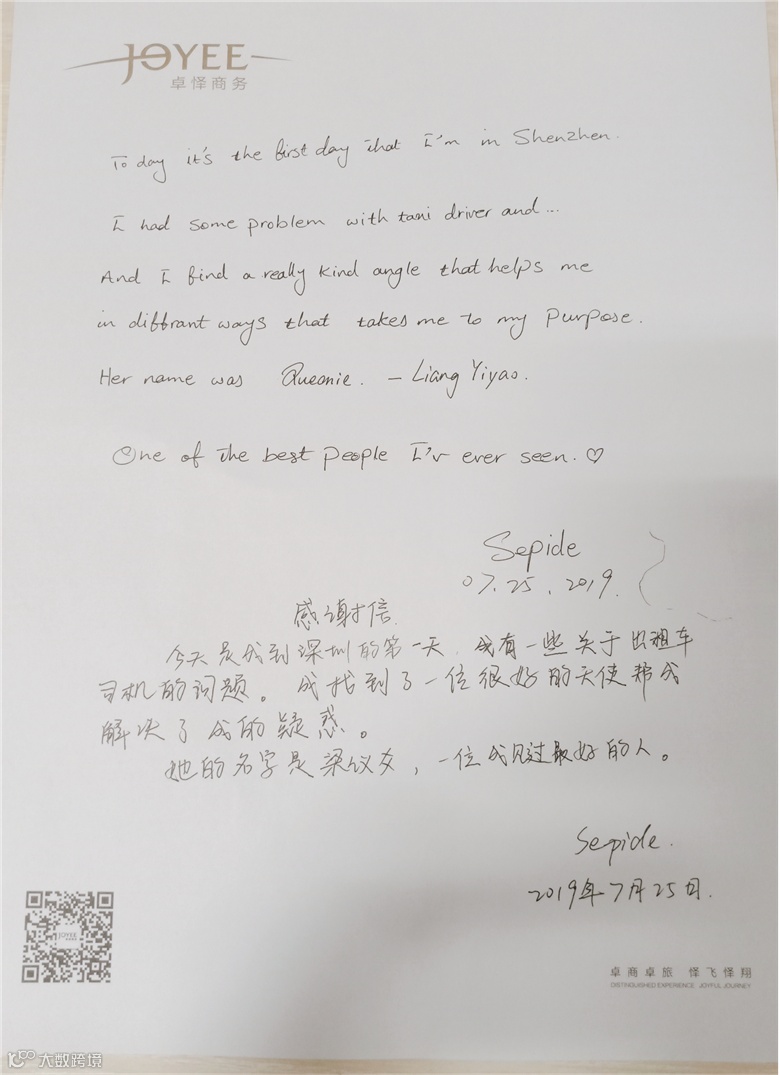 梁议爻说:“她快登机时,一直在前台看着我,我便走上前去询问是否需要帮助,没想到她只是看着我的工牌,问了我的名字后,又认真地读了一遍。然后紧紧握着我的手说,‘梁议爻,这个名字我记住了,我希望你一直都好,感谢你的关心和服务,你笑得很好看,让我觉得很温暖。’”