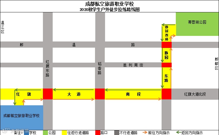 出发路线:一期运动场集合——从一期正大门右转出发-一红旗大道南段一红旗大道南段与静园东路交界处左转——静园东路与郫温路交界处直行——静园西路前行馭 X )米一右转从8号入口进入菁蓉湖公园——沿公园左侧绕湖一圈一一公园6、7号场地集中休息