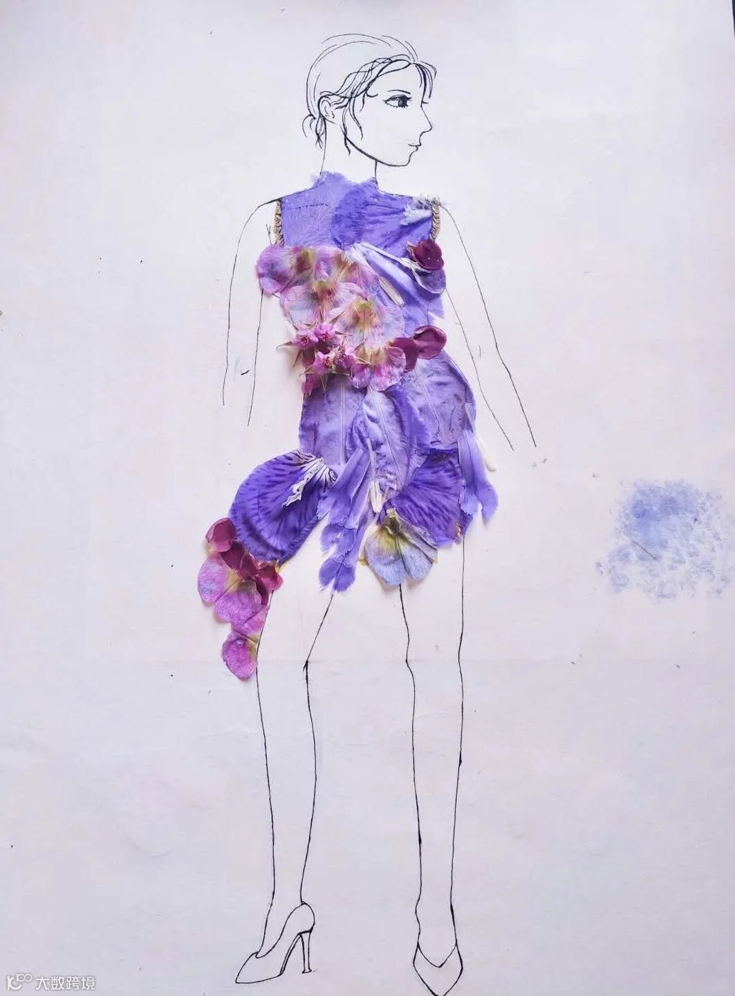 灵感来自于田野里的花儿,蒲公英 ,简单的线条搭配着紫色的裙身加白色的裙边,蒲公英做的肩围以此来衬托女性的美。