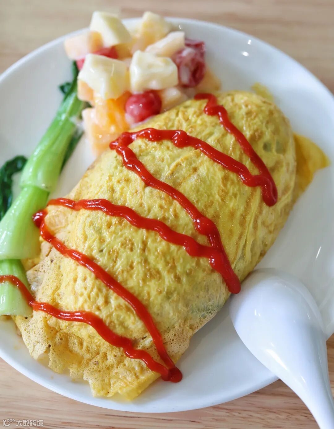 蛋包饭:将鸡蛋煎成厚薄均匀的蛋皮,放上炒好的炒饭、其他各种材料包好,再加上番茄酱,分量超足,一份管饱,还配有水果沙拉……