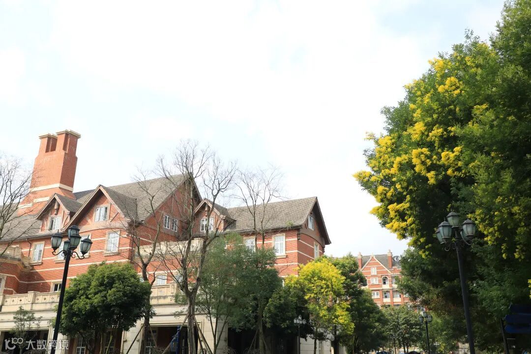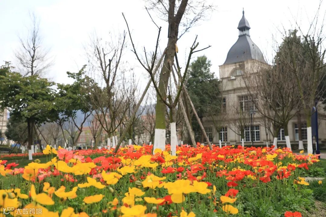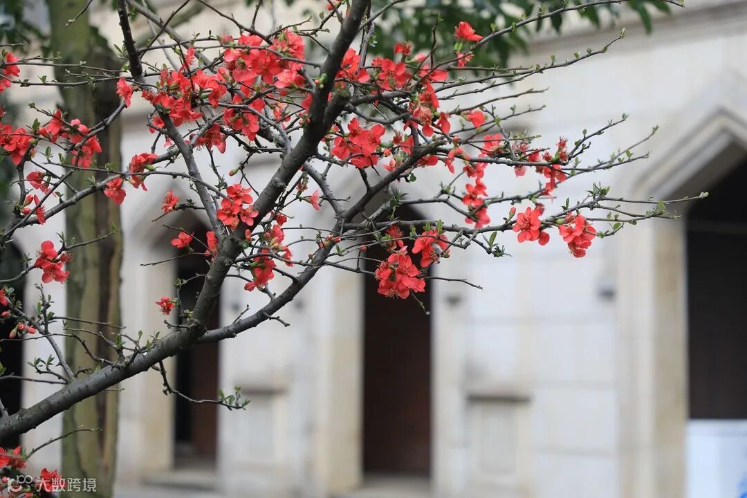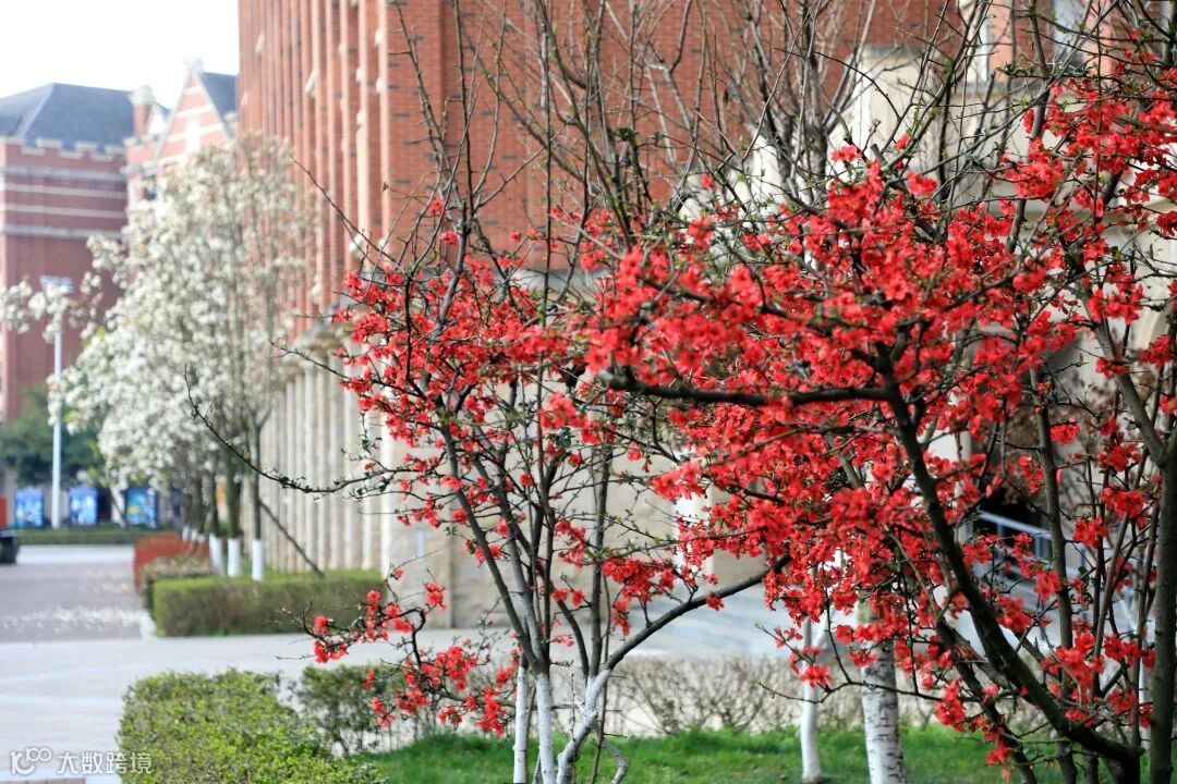 教学楼前点缀着春的颜色