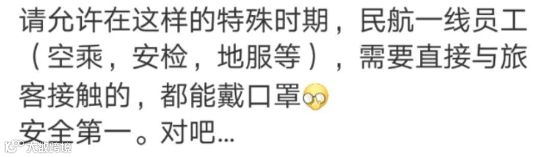 来自乘客的发自内心的诉求,引起一系列反响,各大航司纷纷采取措施,空姐、空保、地服等人员戴上口罩,在保障春运顺畅的同时,齐心协力,抵御疫情。