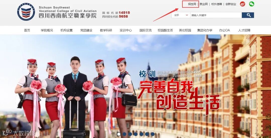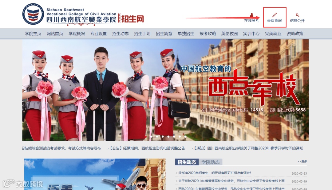 第1步:登录四川西南航空职业学院官网www.xnhkxy.edu.cn,从右上方进入招生网,依次点击“录取查询”。