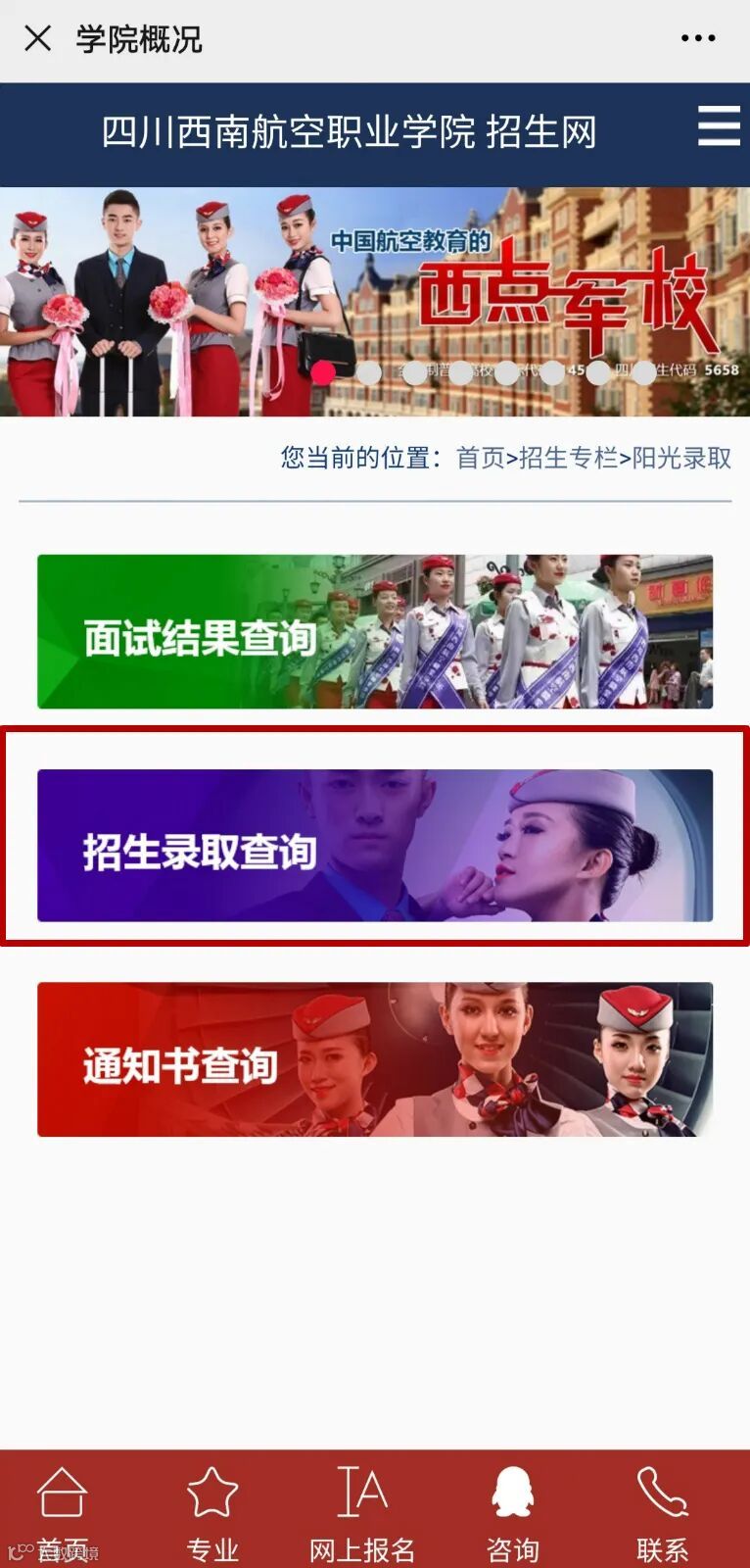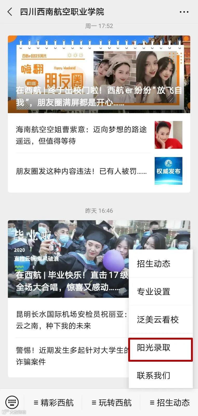 第1步:关注四川西南航空职业学院官方微信,点击进入右下角“招生动态”,点击“阳光录取”,进入查询页面。