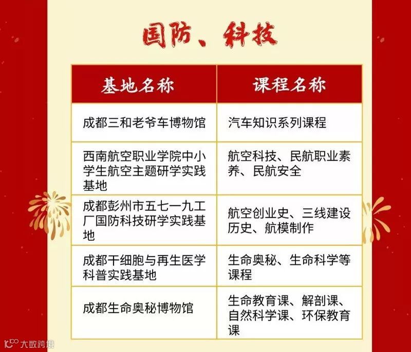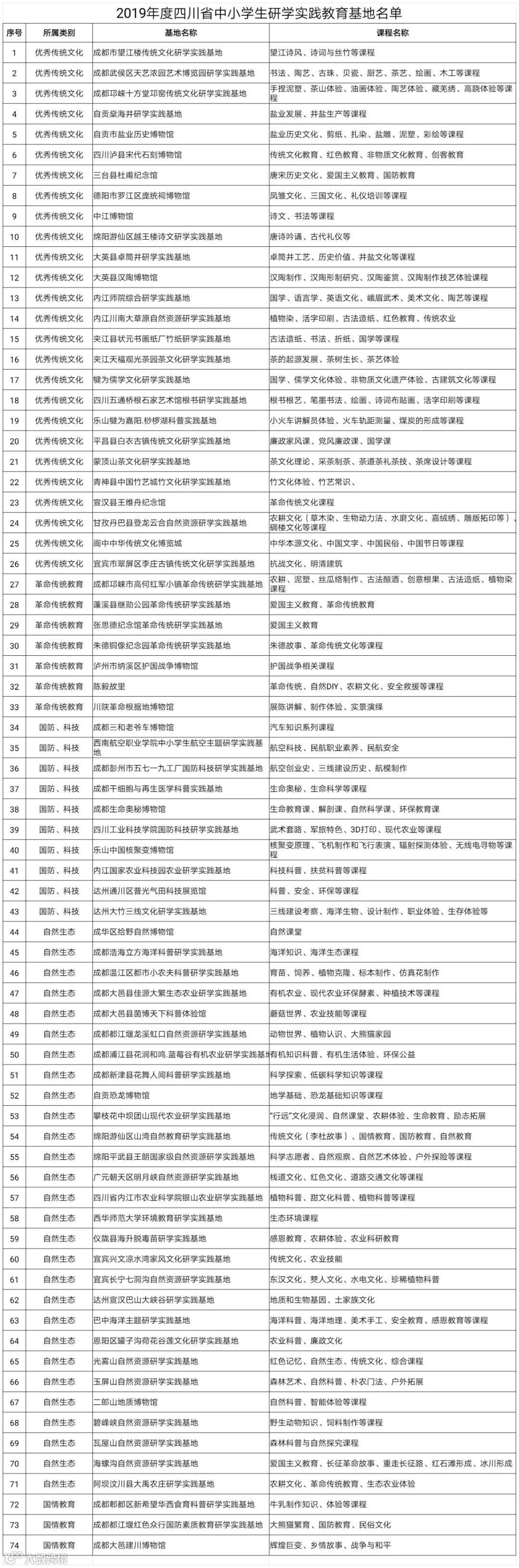 据《四川省教育厅关于遴选2019年度中小学生研学实践教育基地(营地)的通知》,在各市(州)教育行政部门推荐的基础上,经专家评审、网站公示,现命名成都市望江楼传统文化研学基地等74个单位为“四川省中小学生研学实践教育基地”,在“国防、科技”类别中,西南航空职业学院中小学生航空主题研学实践基地名列其中。