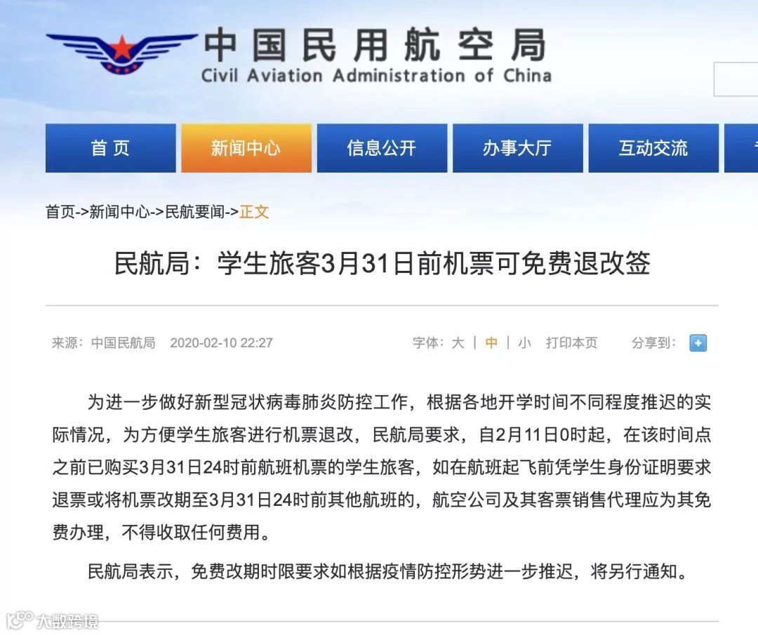 民航局通知,学生旅客3月31日前机票可免费退改签。