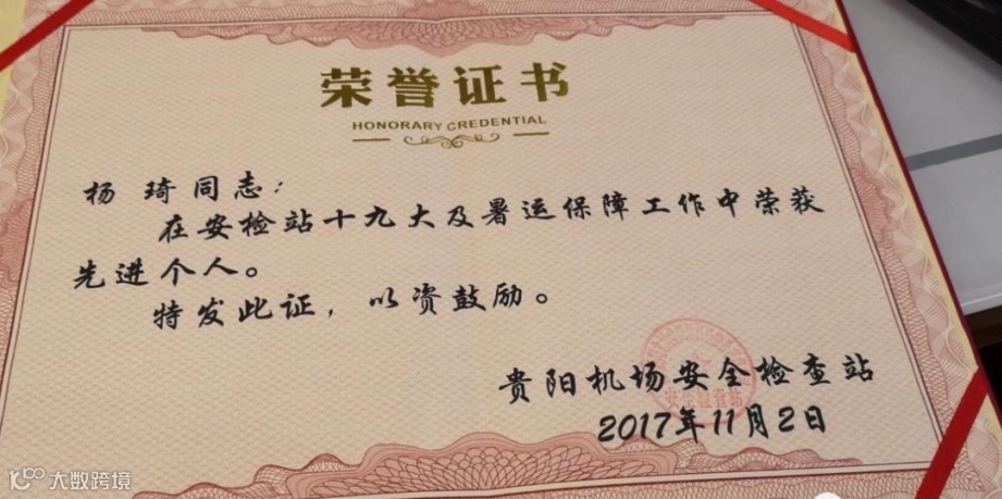 凭借着出色的工作表现,杨琦获得了“安检站十九大及暑运保障工作先进个人”荣誉称号,这让他从中得到了莫大的鼓励和持续上涨的热情,他说:“工作即使会辛苦,但是在付出之后得到的回报,得到的进步,让我获得了极大的成就感,也让我更加肯定了自己的选择。”