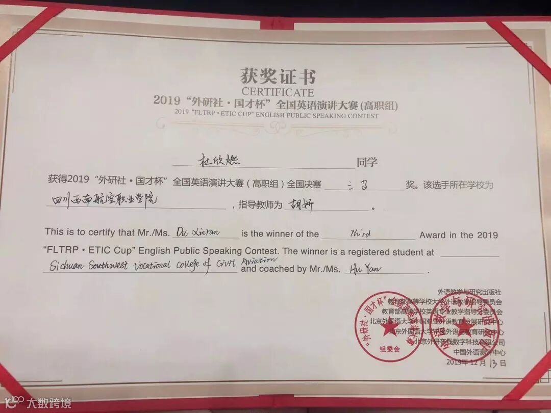 近日,2019“外研社·国才杯”全国英语演讲大赛在北京举行,四川西南航空职业学院杜欣燃代表四川省(高职组)参赛,在与全国众多选手的较量中,其凭借扎实的英语能力与出色的个人风采,最终荣获2019“外研社·国才杯”全国英语演讲大赛(高职组)三等奖,为自己北京之行画上了一个圆满的句号。