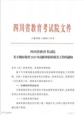 为进一步满足尚未报名考生的需求,四川省教育考试院近日发布【2020】14号文件《关于做好我省2020年高职单招补报名工作的通知》,具体相关事宜安排如下: