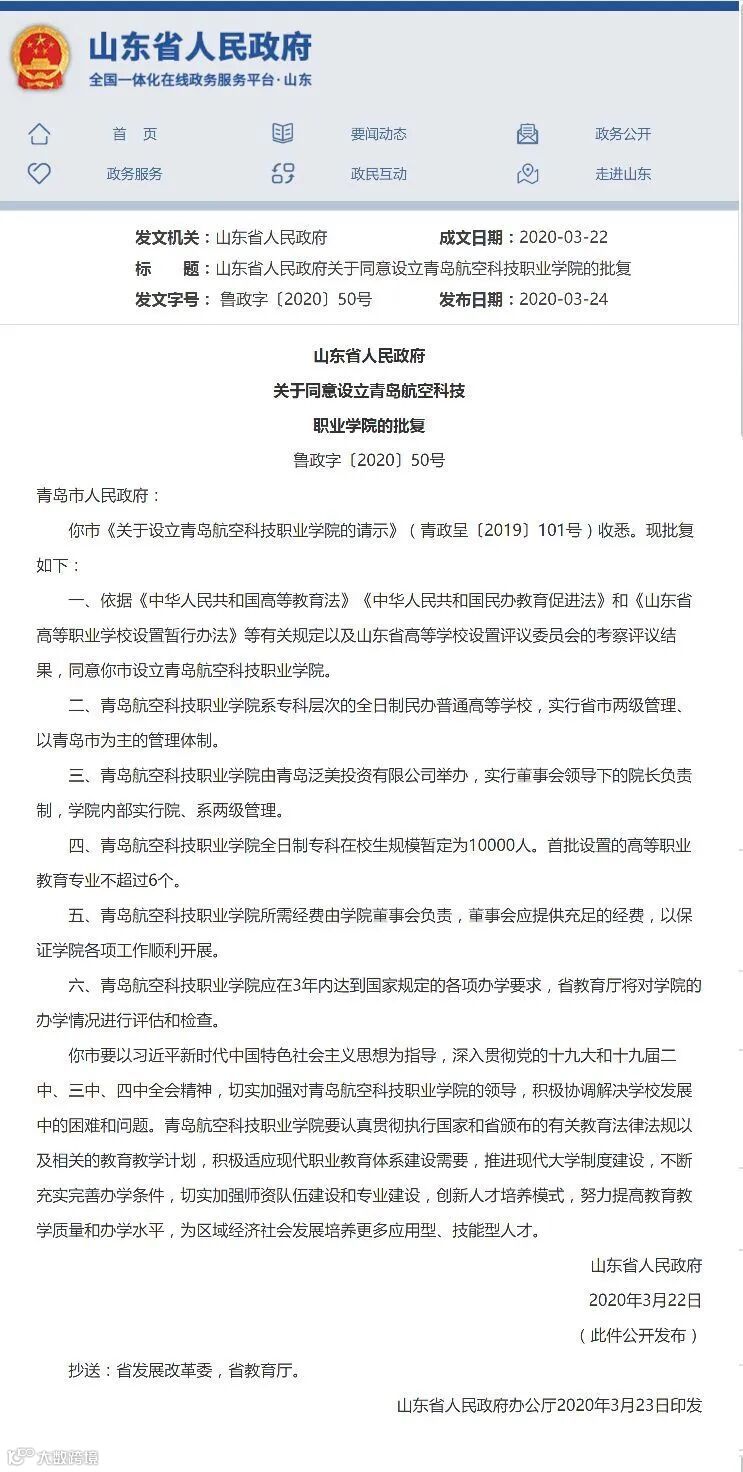 近日,依据《中华人民共和国高等教育法》、教育部《高等职业学校设置标准(暂行)的通知》和《山东省高等职业学校设置暂行办法》等相关规定,结合山东省和青岛市经济社会发展需求和高等教育发展实际,山东省人民政府同意青岛市设置青岛航空科技职业学院,这是泛美教育集团在中国北方成立的首所高职学院,也是泛美教育集团2020年继绵阳飞行职业学院以后,获批成立的第二所高职学院。