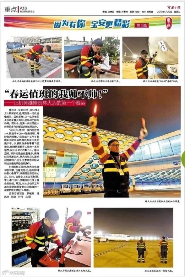 春节本该是万家灯火,阖家欢乐,但林大为和其他民航人的春节一样,是默默的坚守和付出。正是由于这高度的敬业精神,2019年1月29日,林大为的第一个春运保障的故事被《宝安日报》刊登报道,他和老师、同学、家人一起分享,大家纷纷对其表示鼓励和赞扬,这也成了他心中的一股强大的精神力量。