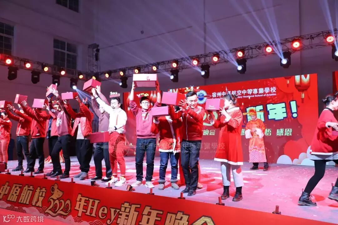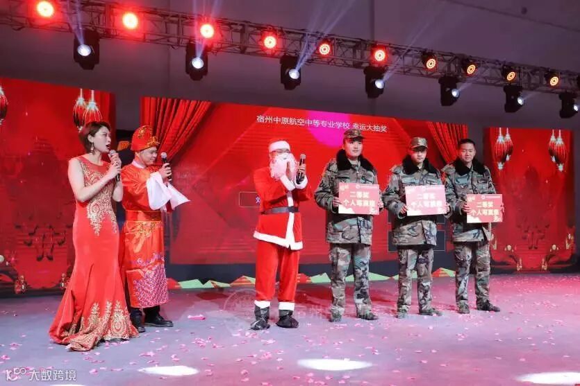 晚会互动环节以及颁奖仪式也精彩纷呈。宿州中原航空中等专业学校校长杜政先生与副校长段玉超先生分别化身圣诞老人与财神爷,与学校老师教官共舞。随后,老师们为现场同学分发小礼物,将欢乐与甜蜜洒满晚会现场!