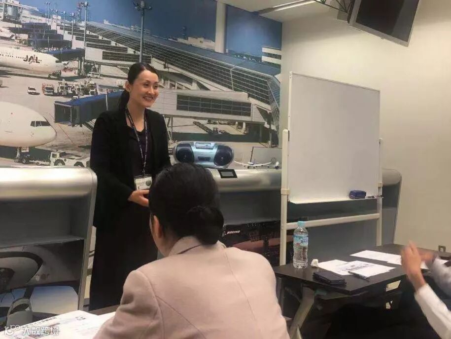 这是日本学校教授礼仪的老师,她告诉我们全日空航空公司最基本的就是要做到能看懂乘客的脸色,及时地去满足乘客的需求。这位老师全程说话温柔,一直面带微笑和我们交流。在课堂上,日本的学生给我们演示礼仪,他们脸上总是带着微笑,感觉他们真的很开心。