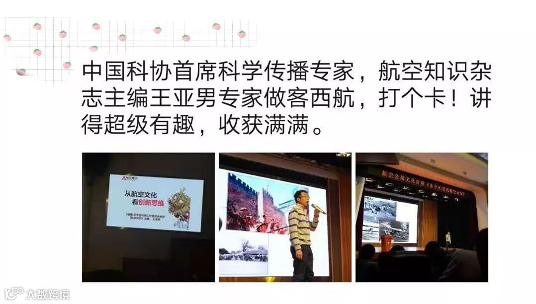 12月20日上午10点,一场精彩的航空公益文化讲座在西航博雅讲堂举行。中国科协首席科学传播专家,立巢航空博物馆特邀顾问、航空知识杂志主编王亚男带来《你不知道的航空故事》主题讲座,声情并茂的风格,案例丰富的演讲,使得现场的气氛十分热烈,到场聆听的西航师生们都表示收获颇丰。