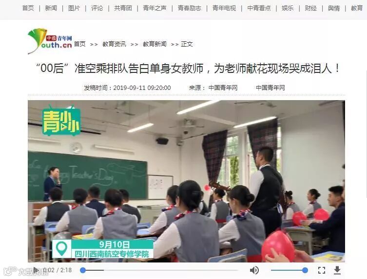 9月10日,教师节当天,四川西南航空专修学院“00后”准空乘为单身女教师策划了一场特别的教师节祝福。学生们弹吉他唱歌送花向老师告白,集体排队拥抱老师,现场老师学生哭成泪人。