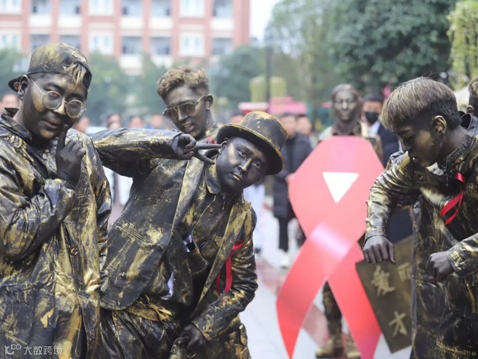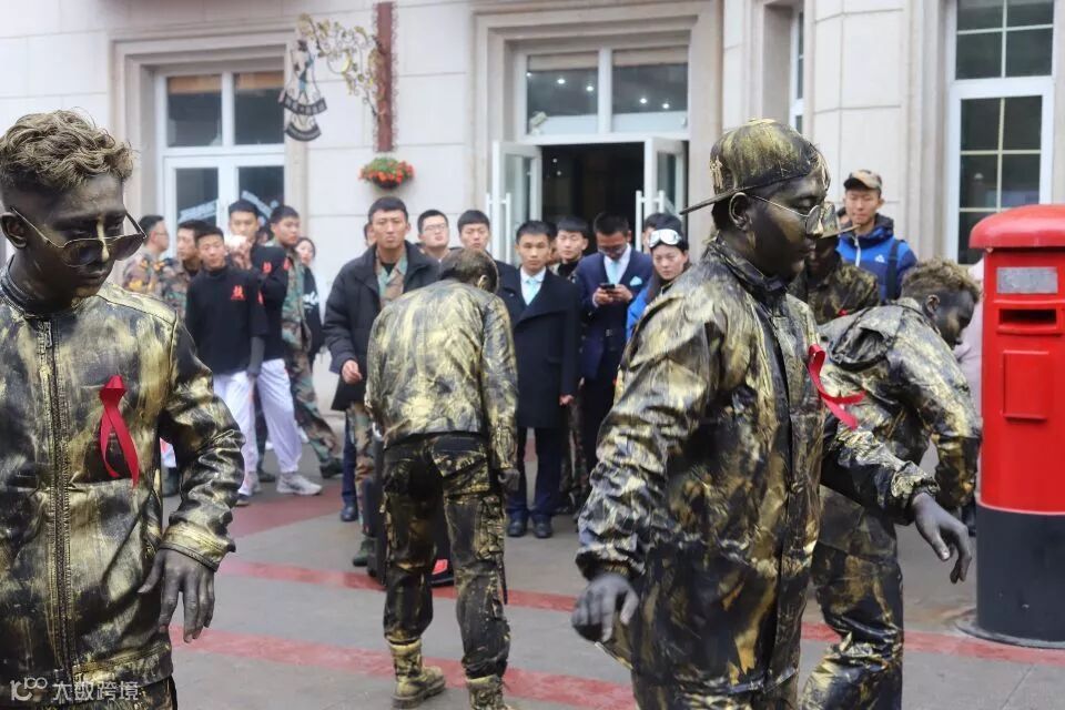 在世界艾滋病日前夕,四川西南航空专修学院的同学们举行了一场宣传防艾的行为艺术活动,TA们将自己装扮成“铜人”,吸引了众多的同学的围观。