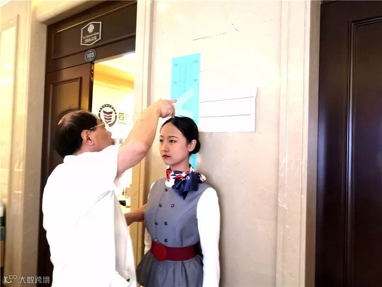 在首先进行的海选环节中,面试官根据同学们的站姿、外形等条件进行第一轮的筛选,然后由航医进行身高测量。