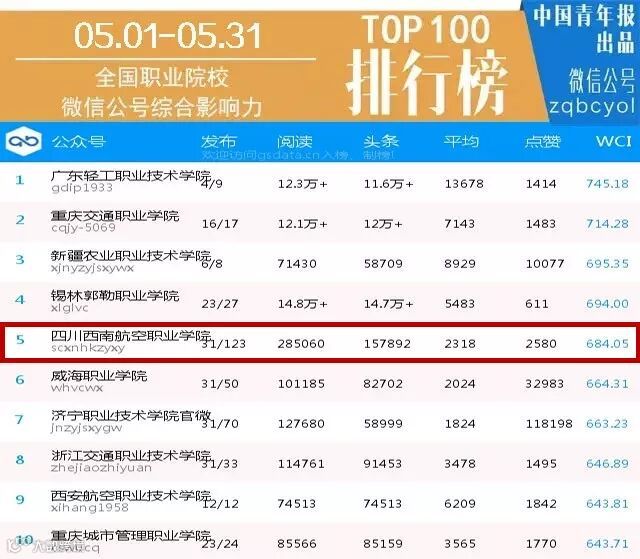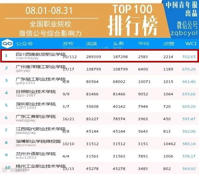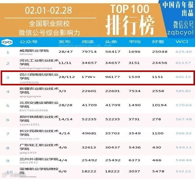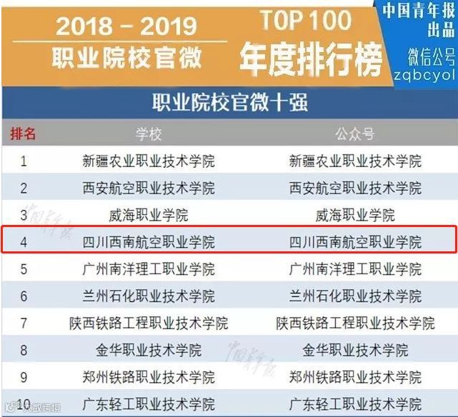 一直以来,四川西南航空职业学院官微在《中国青年报》全国职业院校新媒体每周的排行榜中多次位列前十,稳居前列。