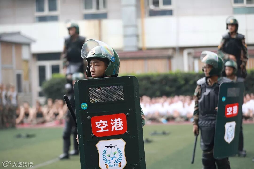 乐声如雷鸣响起,空港军人气势涛涛不可挡,庄重站姿目光肃穆守望远方。厚实铁盾构筑前线一方,身形与警棍一同扎根伫立,身后五星红旗随风动鼓鼓飘扬。