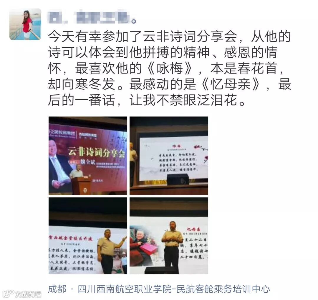 今天早晨9点,西航师生们翘首以待的博雅讲堂又一次精彩开讲,由泛美集团董事局主席、四川西南航空职业学院终身荣誉院长、研究员 魏全斌(笔名云非)带来诗词分享会。他用诙谐、幽默的语言,为所有师生讲述了诗词创作的背景和心得体会,并现场和同学们互动交流,现场气氛非常热烈。