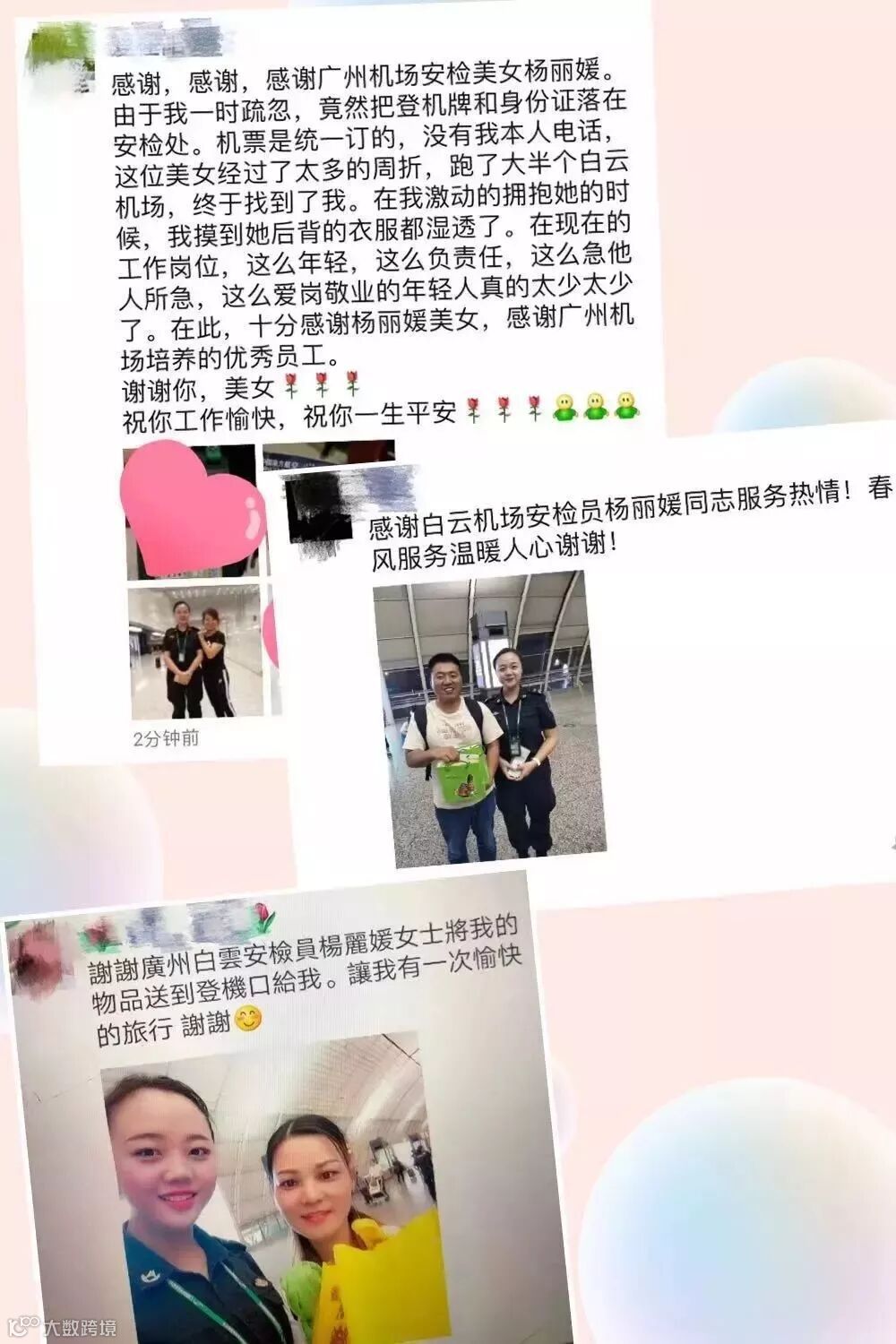 🔸杨丽媛 广州白云国际机场安检员 旅客们多次发朋友圈赞扬其细致入微,并赠送锦旗“热情待人,真情服务”。