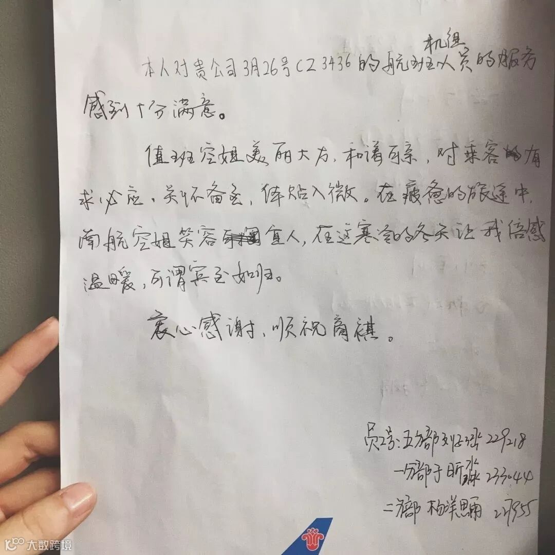 🔸杨洋思雨 中国南方航空乘务员 多次收到旅客手写表扬信,高度赞扬其优质的服务