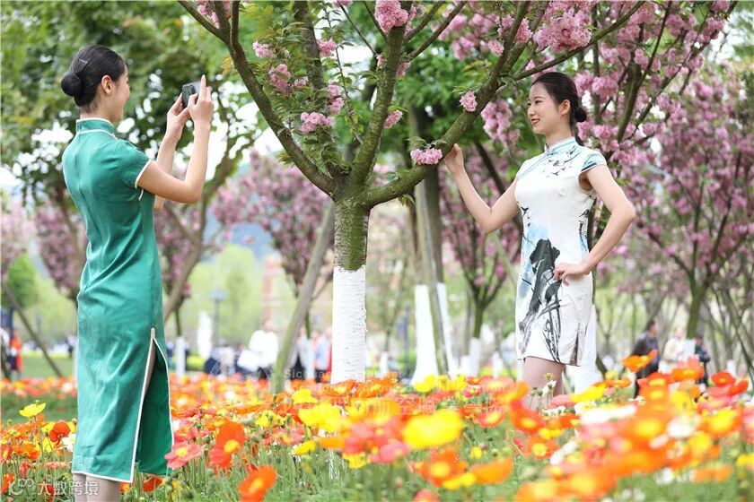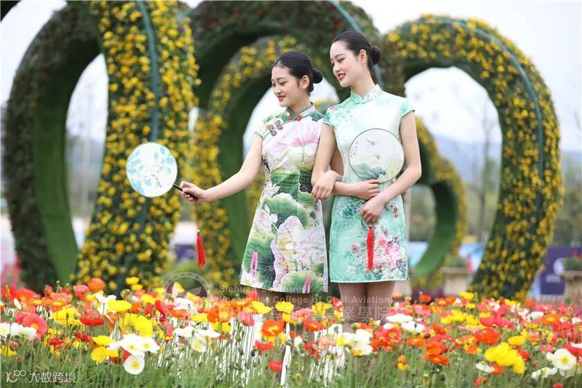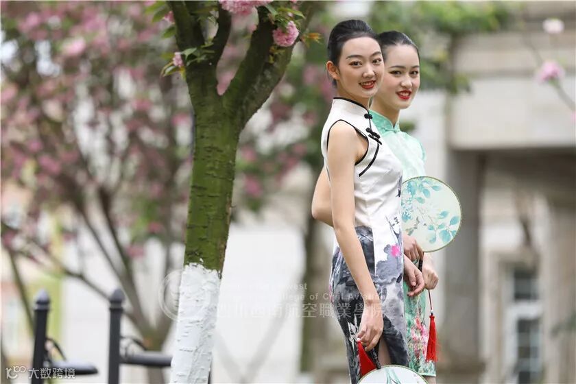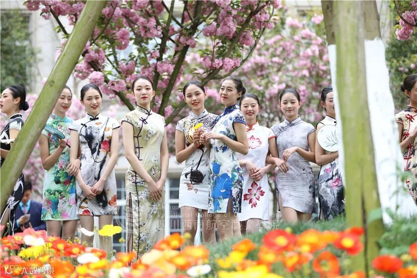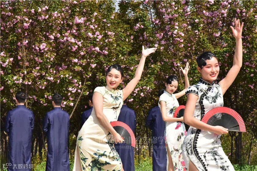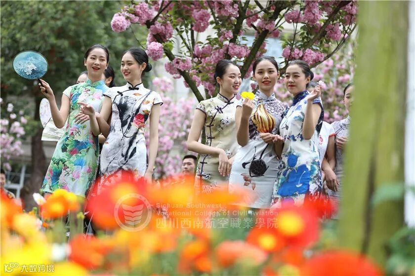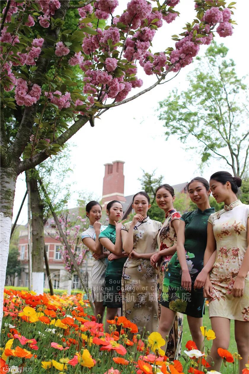 趁此美好时光,四川西南航空职业学院的“准空乘”们,着一身旗袍,执一柄团扇,绾一头发髻,和三五好友相约西航校园的春天,来一场“花式赏花”。。