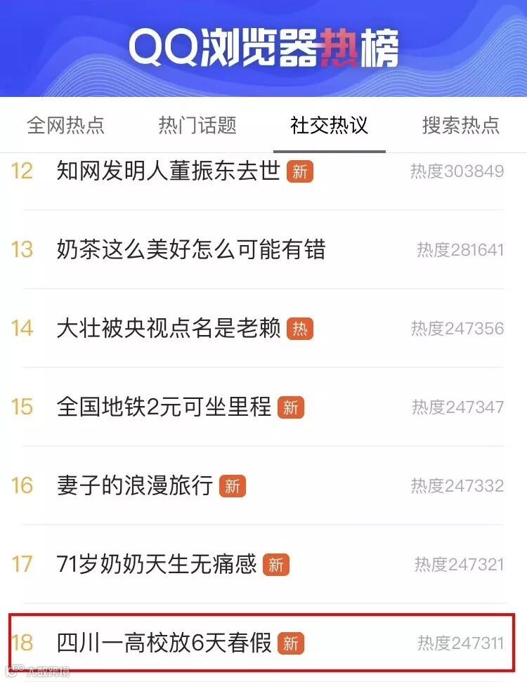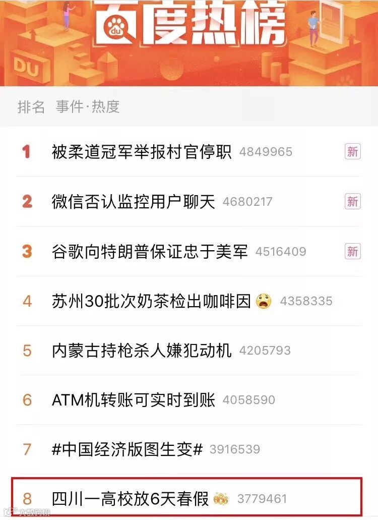 除了微博热搜榜,“四川一高校放6天春假”的话题还登上了其他多个新闻客户端的头条推送、热搜版……