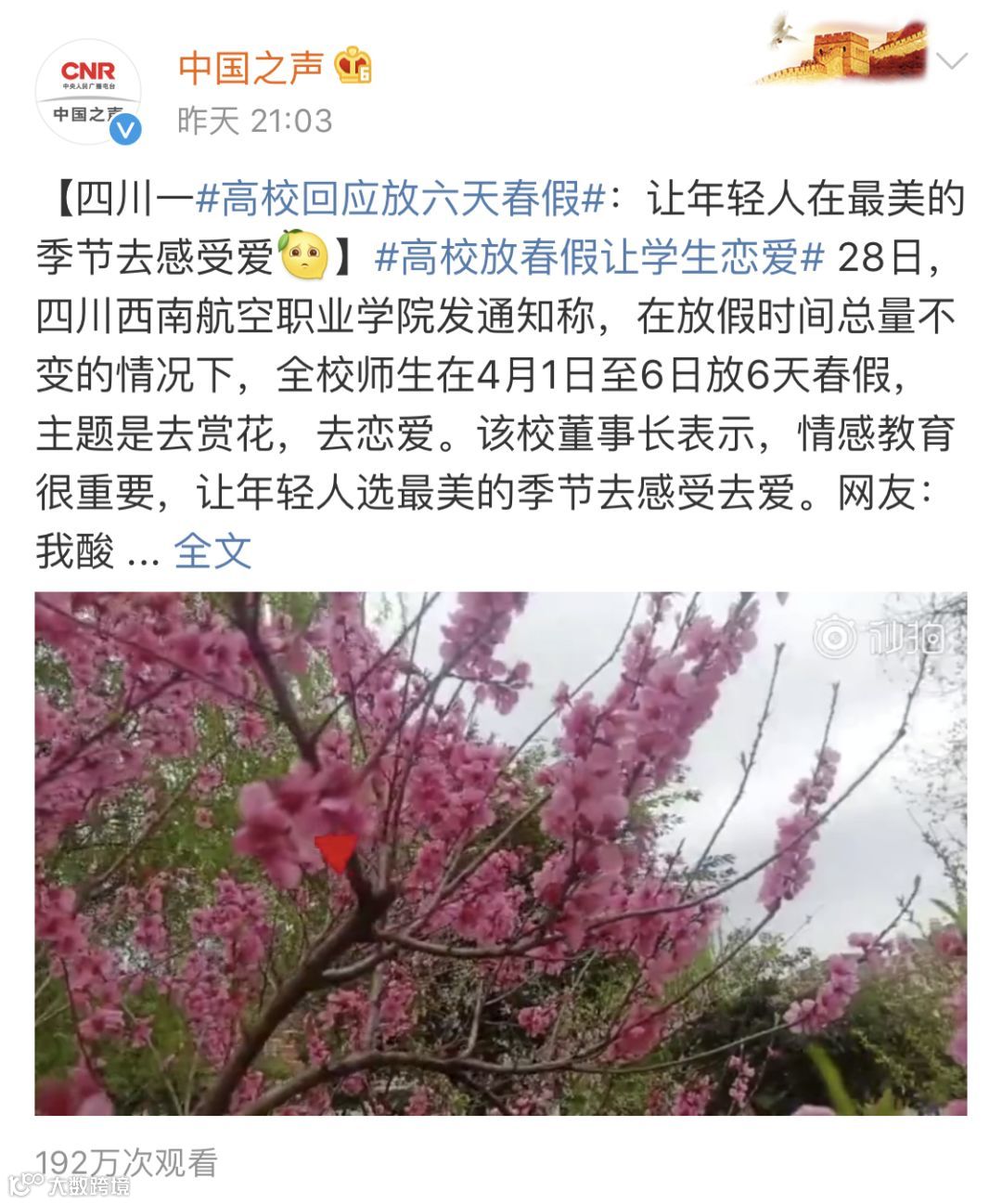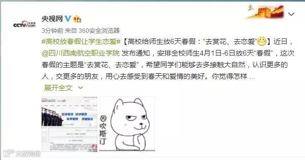 除此之外,西航君现在上网输入“高校”两个字,首先出来的就是“高校放6天春假”,可见“泛美春假”这个决定是多么的深得人心。