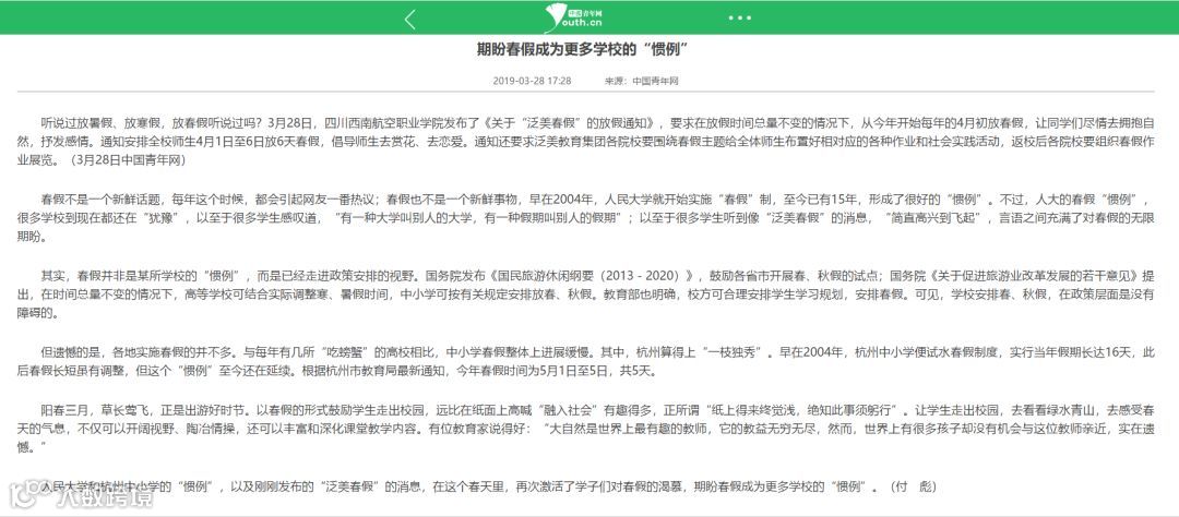 【中国青年网评论:期盼春假成为更多学校的“惯例”】