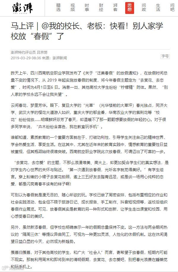 【澎湃评论:马上评|@我的校长、老板:快看!别人家学校放“春假”了】