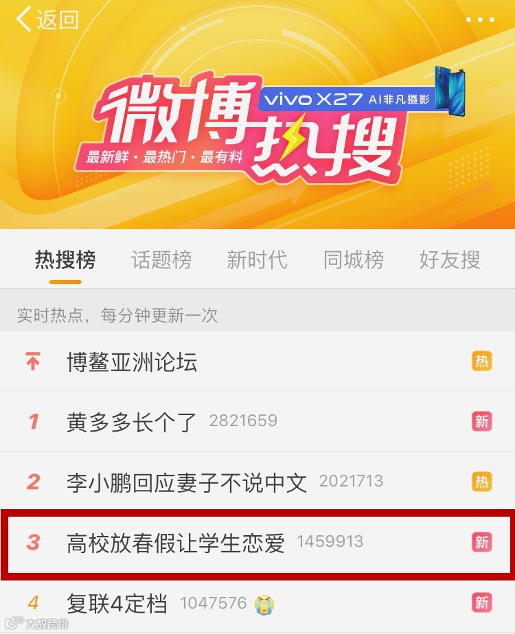 3月28日19:00 话题“高校放春假让学生恋爱”以第3的排名登上微博热搜榜