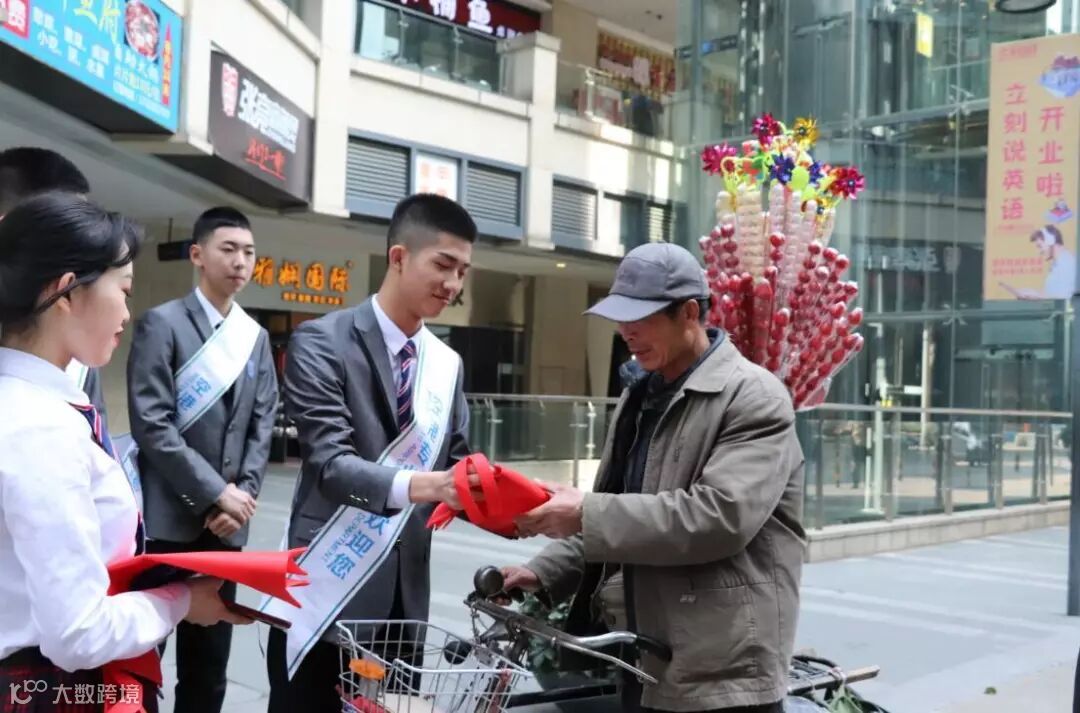 同学们为不同职业的人发放布袋,希望能提醒大家减少白色垃圾,爱护身边环境。