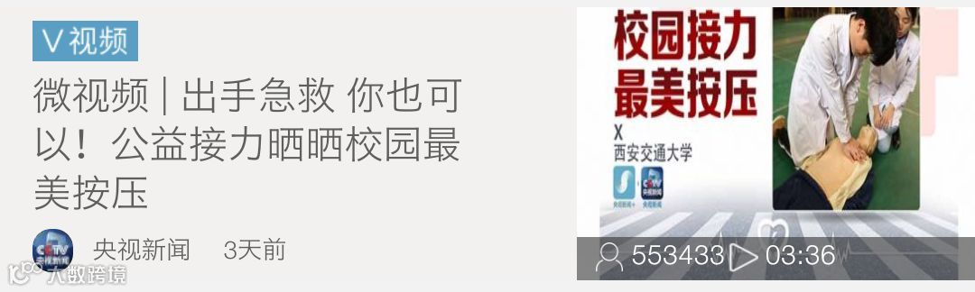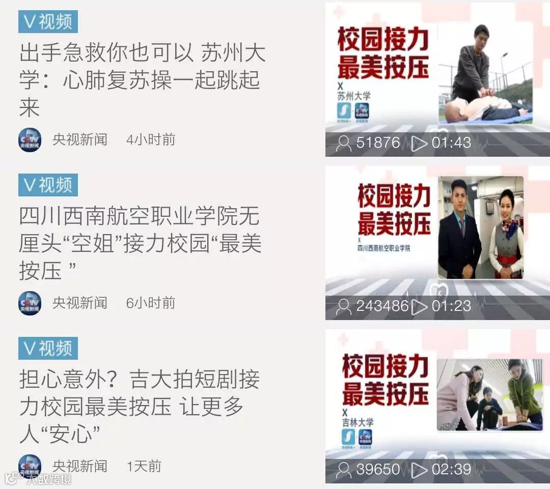据统计,经过心肺复苏培训合格的公众不到全国人口的千分之一。央视新闻在青春学子中发起校园行动——“最美按压”公益传递,呼吁广大学生参与、普及心肺复苏急救的知识与技能。截至目前,全国已有苏州大学、吉林大学、上海交通大学、四川西南航空职业学院等多家知名大学参与。同时,还有更多名牌大学正要参与进来,介绍心肺复苏术的急救常识,挽救更多生命。