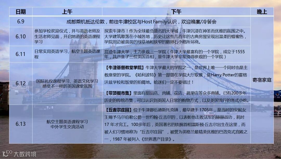 深度体验英伦文化:深度融入英国本土生活一周,入住本地寄宿家庭,练习日常英语用语,感受最真实的英式生活方式,深入了解英国社会文化,培养海外生活适应能力,结交英国友人。