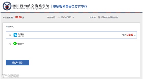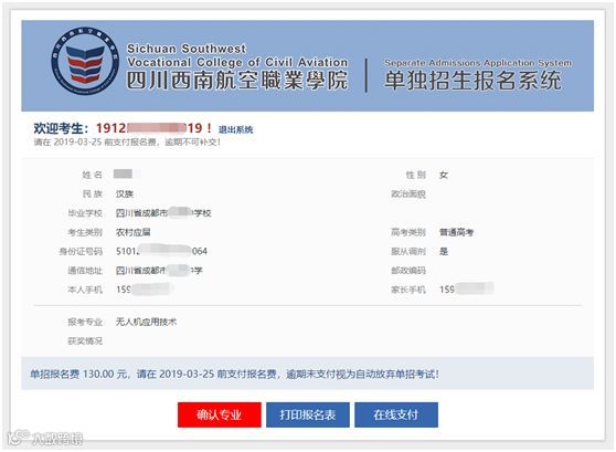 四川省2019年高职单招网上报名阶段现已结束,现进入学校确认专业和缴纳报名费阶段。各位考生应于2019年3月19日8:00至25日18:00,登录四川西南航空职业学院网站,点击单独招生进入我院单独招生管理服务系统(http://dzxt.xnhkxy.cn),确定报考专业,并缴纳报名考试费,报名确认以网上缴费为准。