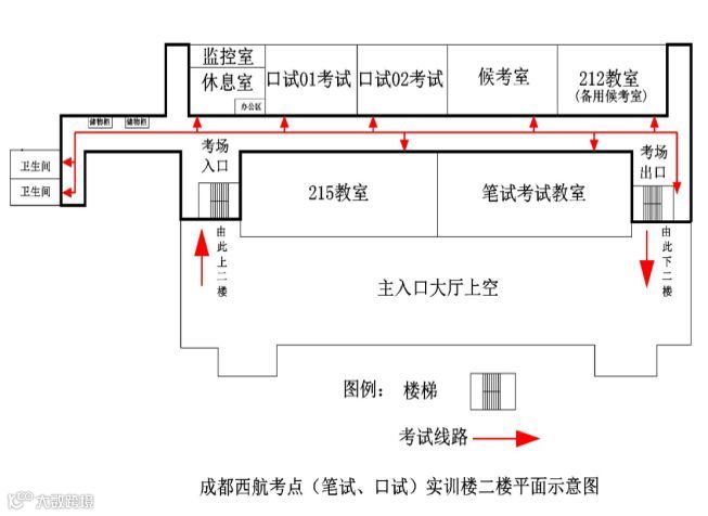考点地点为四川省成都市金堂大学城学府大道996号四川西南航空职业学院(国家级3A景区),考试场地为四川西南航空职业学院实训楼二楼,216教室为笔试考场、213教室为候考室、111办公室为考点档案存放室,实训楼214教室为口试01考场、口试02考场、考官休息室、监控室、机房和办公地点,满足规章要求。