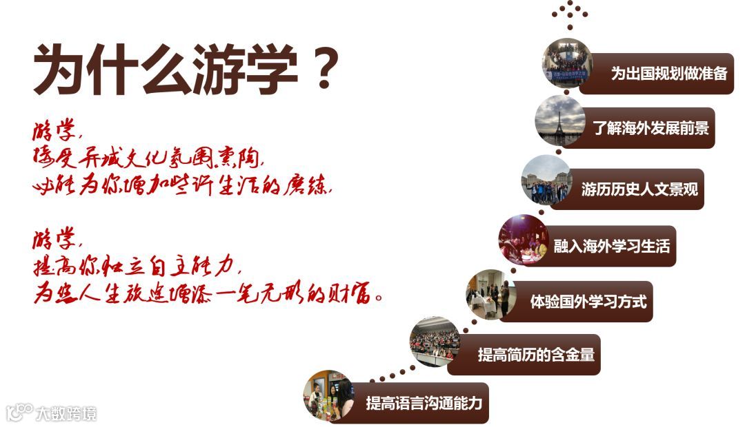 "游学"精神溯源于孔子,孔子周游列国治学精神是现代的游学始源。"游学"既不是单纯的旅游也不是简单的学,在学习之中潜移默化的体验人生,在体验当中学习。游学的本质是文化的融合,游学是协助学员开阔视野,培养国际观和树立坚韧的世界观的一种绝佳方式。