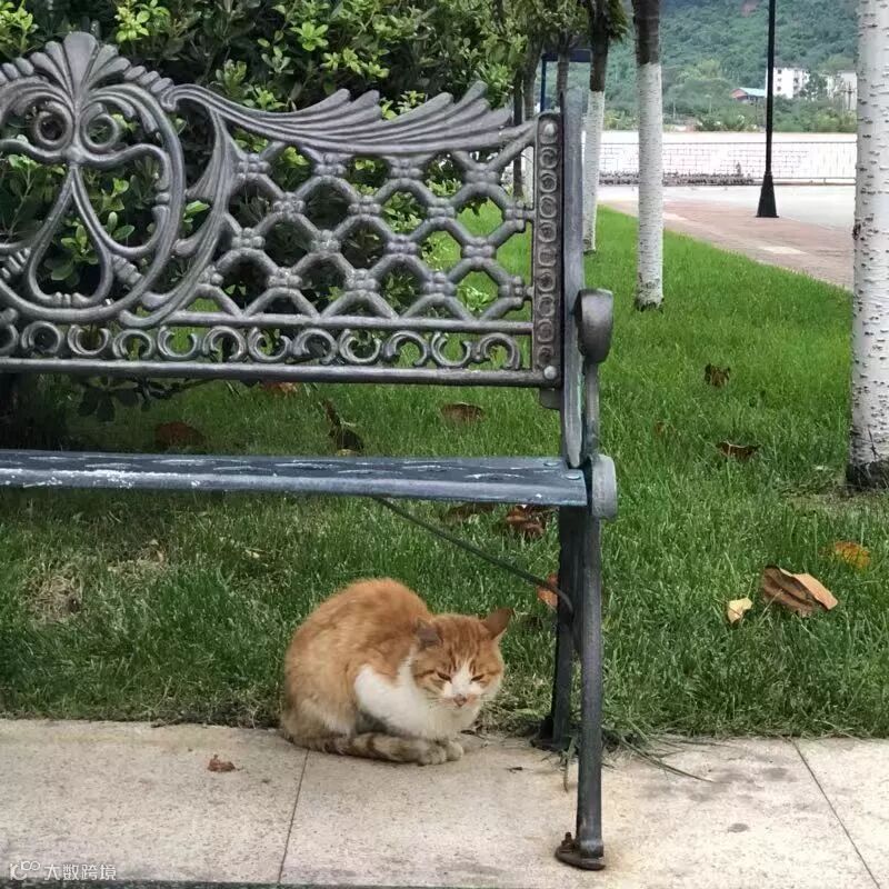 长凳下的身影有些警惕,但冬日的寒冷还是让它不自觉团在一起。好想把它抱在怀里为它取暖啊……