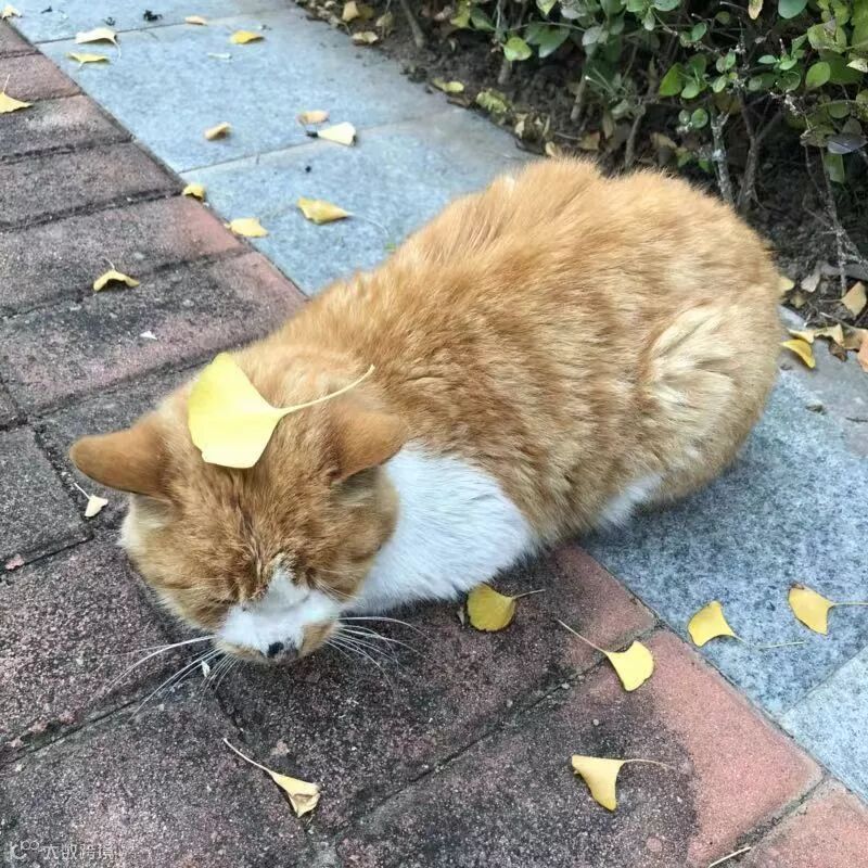 一片银杏落在了喵咪的头上,它浑然不觉,毫无防备的在你面前展现它的信任。你是否有种伸出手来撸猫的冲动?