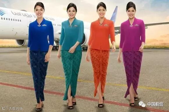 鹰航的制服很有印尼特色,是改良版娘惹装,裙装中大面积使用Batik面料(Batik是一种印尼的蜡染布,2009年被联合国教科文组织列入非物质文化遗产名录),在上衣的衣襟处也可以看到,若隐若现的花纹。这种民族服饰风格的制服,让乘客在一登机,就能感受到东南亚风情的轻松与惬意。