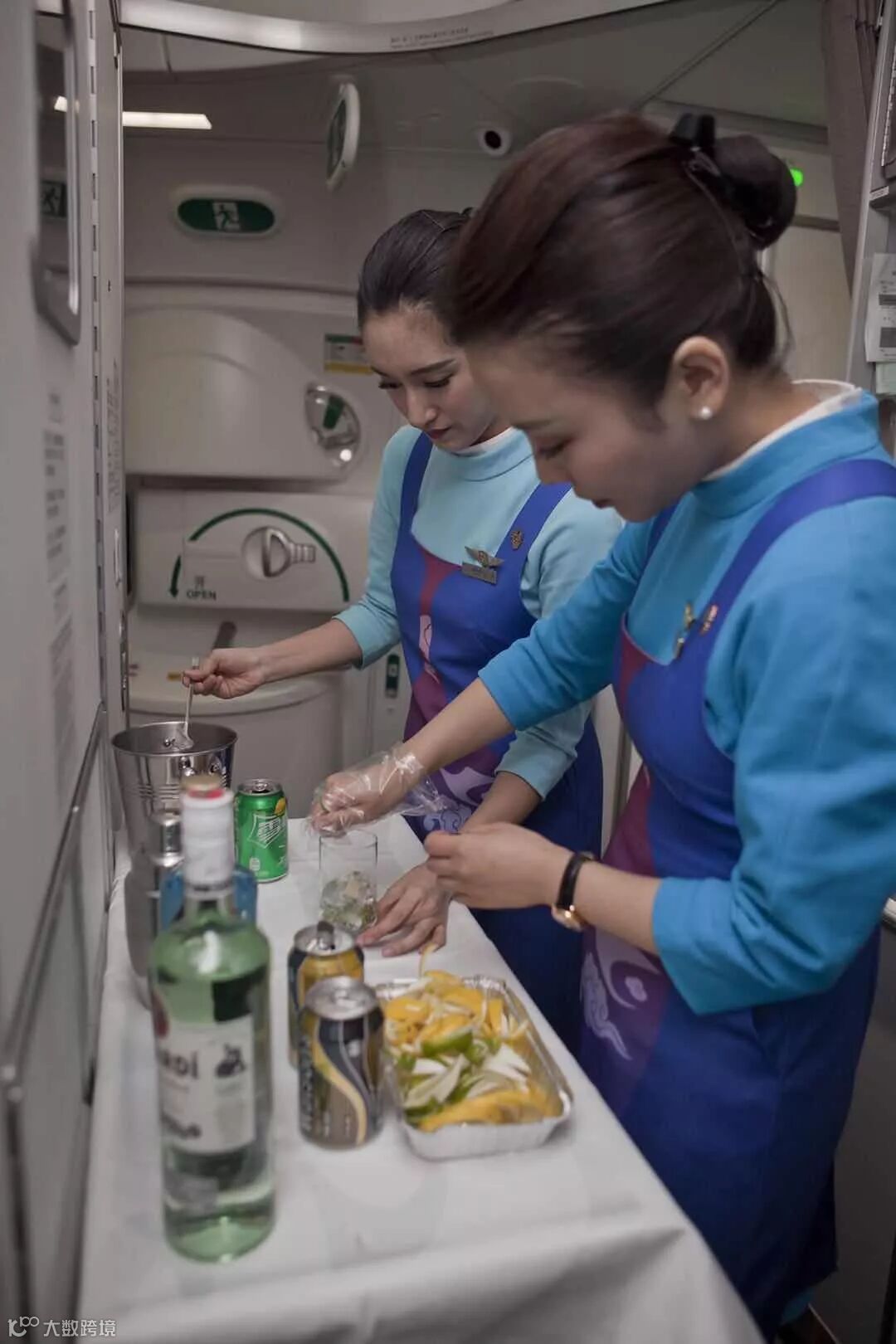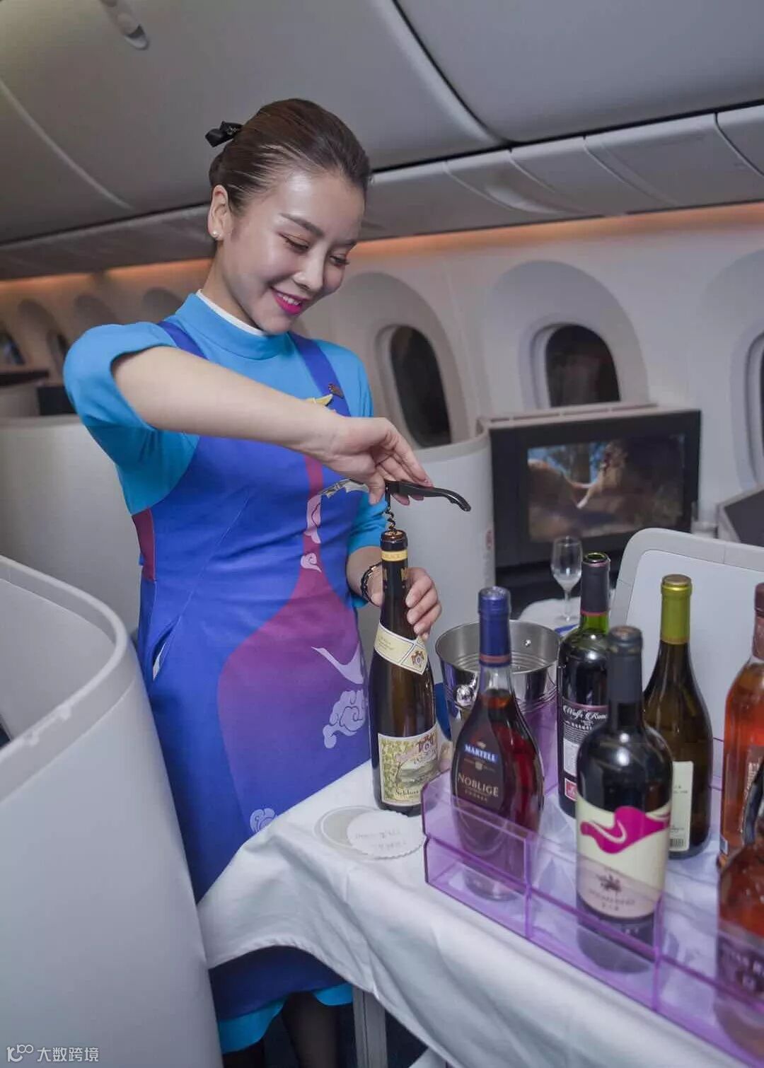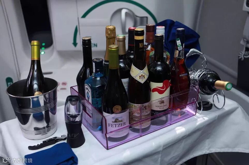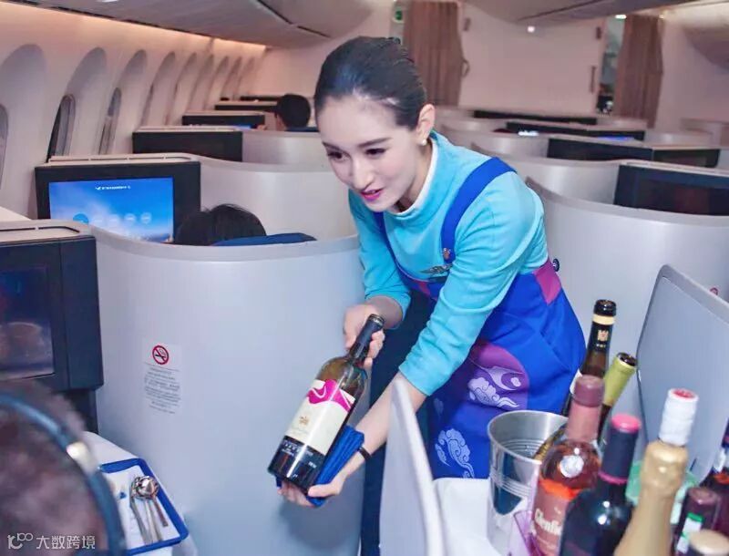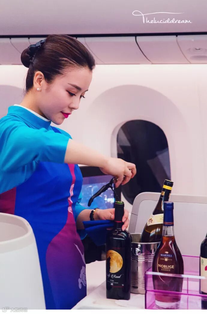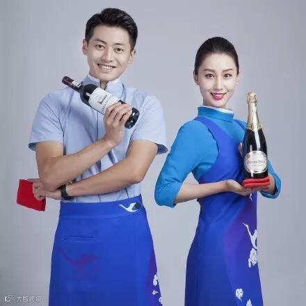 白色的丝线在深蓝色围裙上绣出冲上云霄的白鹭,酒杯的形状映刻在裹身的裙摆,这般装束,大气又不失美观。随后小白鹭推着酒水车款款走到旅客面前,为旅客展示之前点选的酒水。