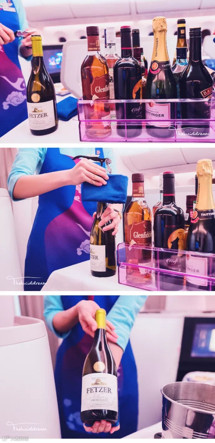有朋自远方来,不亦乐乎。身着侍酒师特定围裙的小白鹭在商务舱旅客第一道餐结束休息的间隙配合天际酒廊酒单的使用为旅客推荐佐餐酒。