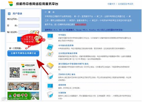 若第一次使用,首先注册中考网络应用通行证。注册后,输入身份证号码、密码及验证码登录,进入填报页面进行志愿填报。若已注册,直接登录。