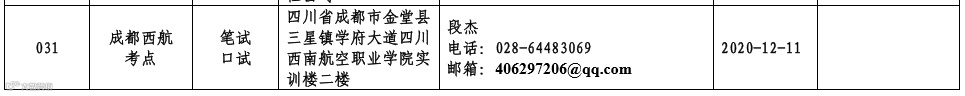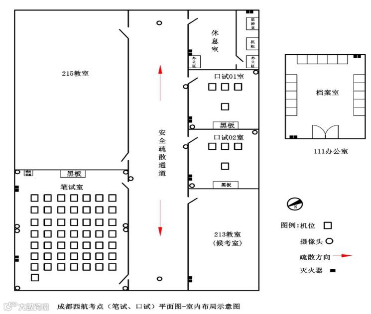 考点地点为四川省成都市金堂县学府大道四川⻄西南航空职业学院996号国家级AAA景区内,考试场地为四川西南航空职业学院实训楼二楼,216教室为笔试考场、213教室为候考室、111办公室为考点档案存放室,实训楼214教室为口试01考场、口试02考场、考官休息室、监控室、机房和办公地点,满足规章要求。