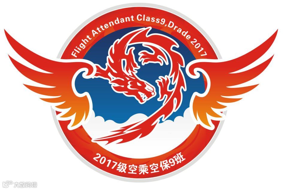 设计理念:队徽通常来源于班级的口号、班号,它是一个标志,标志着大家属于一个班级并且团结一心。它是整个班级的精神的提炼,是班级活力和荣耀的象征。首先外面的圆,代表着一个集体。里面的数字九,代表着空乘九班。外圈的翅膀代表着他们的蓝天梦,飞向蓝天。在天空中自由翱翔,代表着向往的生活。