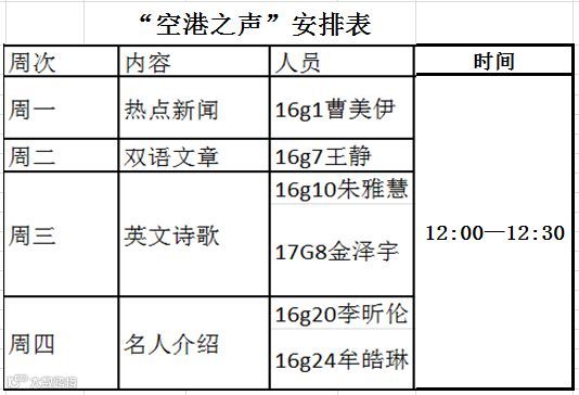 《空港之声》栏目创立于是于2018年3月,立志为成航校学子们打造了良好的英语学习环境。内容包括麻辣、潮流的新闻,悠扬悦耳的诗歌散文,激励人生的名人传记……以个性带给同学们欢声笑语,传递课外知识,提升英语学习氛围。