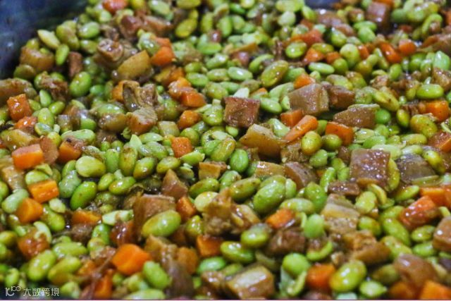 看!红、绿和肉丁混在一起,是不是看着特别养眼呢!鲜红的胡萝卜含有丰富的维生素,搭配着青豌豆和肉丁,是很好吃的菜,不仅色、香味俱全,还是颜值担当!