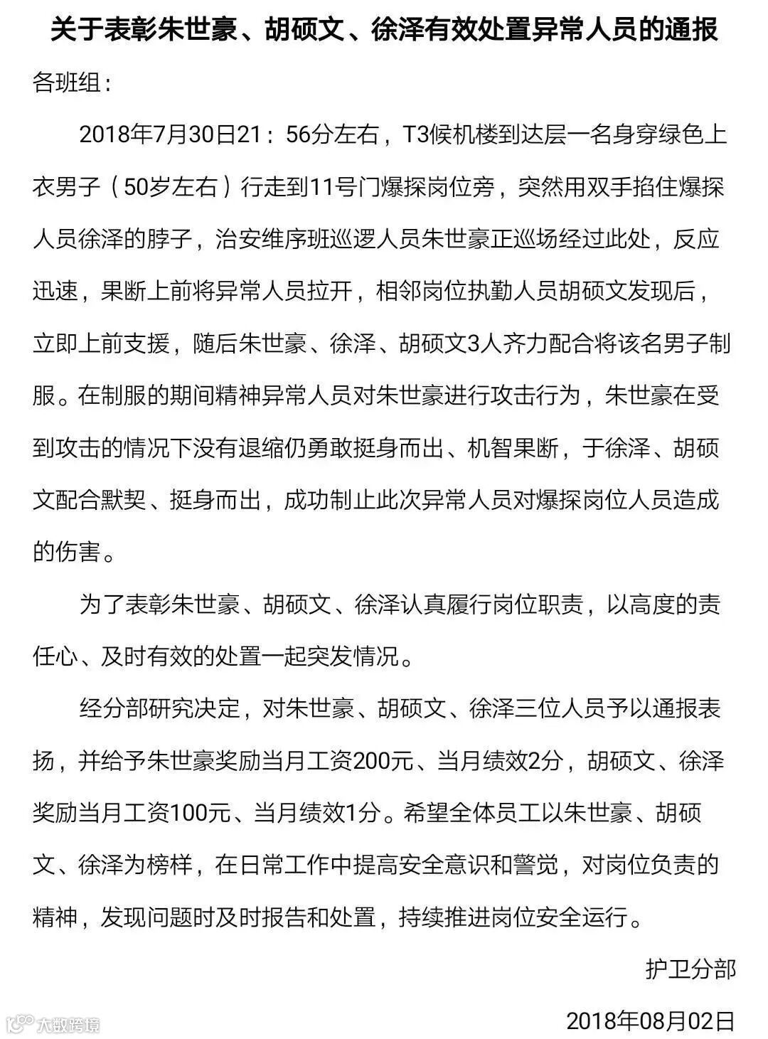 7月30日22点左右,胡硕文正在厦门机场T3候机楼到达层巡视。一名精神异常男子突然掐住了防爆安检员的脖子,并对其进行人身攻击。胡硕文发现紧急情况后,立即上前支援,和同事配合默契、机智果断、挺身而出,成功处置一起精神异常人员扰乱候机楼旅客正常运输的事件。厦门机场安护部护卫分部为此进行了表彰通报。今日头条、中国民航专业网站—民航事儿、国际空港信息网也相继进行专访报道。