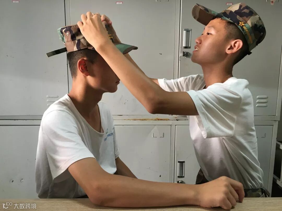 空乘部高铁邮轮18级3班新生孙浩渝正细心地为小伙伴陈盛豪整理军帽。